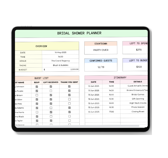 Organize themes, budget, itinerary, checklist, and guest details for a bridal shower to remember.