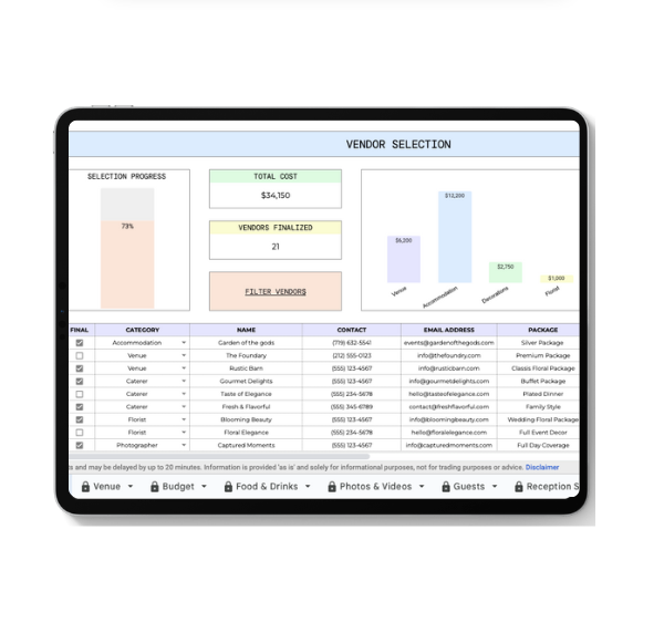 Track your total budget, log every expense, and see what you’ve paid each vendor — all in one easy-to-use sheet.